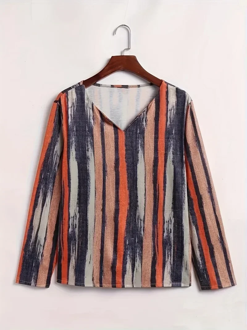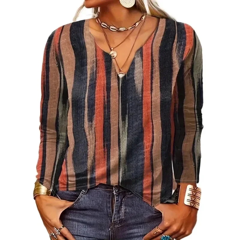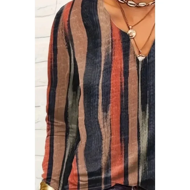 Women's Plus Size 1XL-8XL Casual Comfortable Long Sleeve Top Fashion V-neck Striped Breathable T-shirt Women